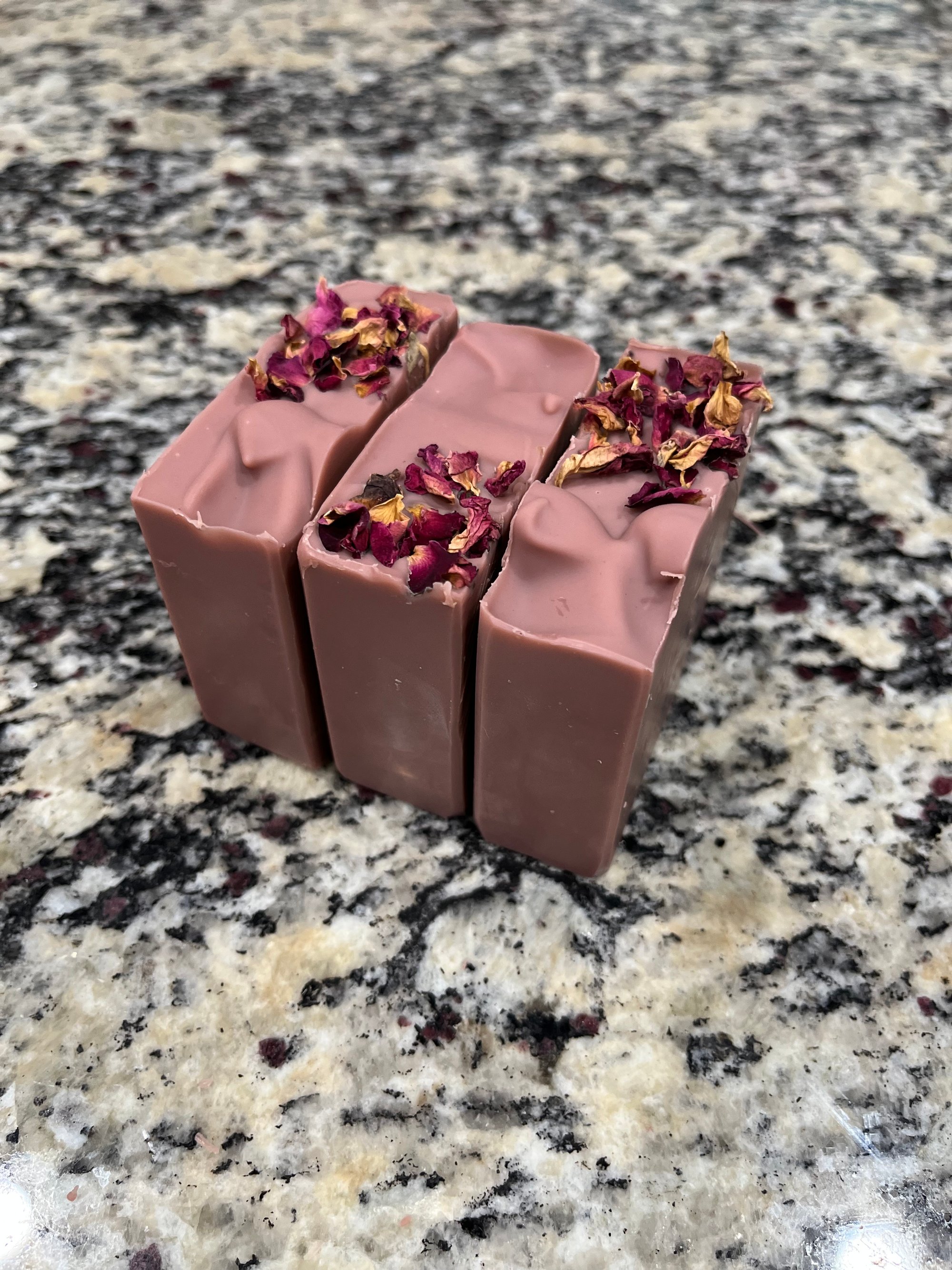 Saponified oils-Olive oil, Coconut oil, Cocoa butter, Avocado oil, Kaolin clay, Moroccan red clay, Rose petals, Bergamot eo, Lavender eo and Geranium eo.